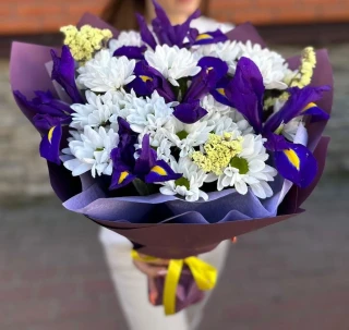 Нежные кустовые хризантемы и изысканные ирисы создают особый букет "Игривые лепестки". Их волшебное сочетание поражает своей изысканностью и неповторимой красотой. Кустовые хризантемы привносят в букет нежность и романтику, а ирисы добавляют изящность и таинственность. Лимониум, украшающий этот букет, словно нить счастья, обвивает каждый цветок и придает ему особый шарм.